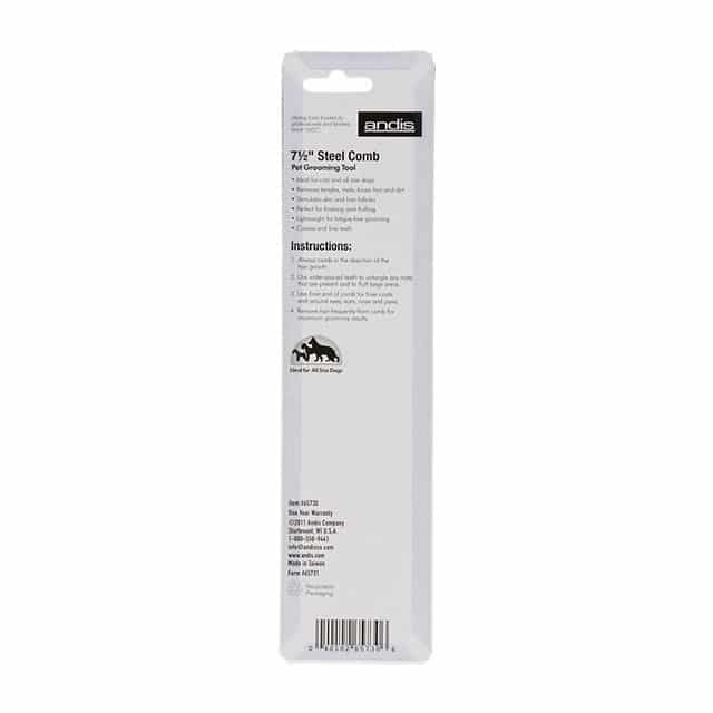 The Andis stainless steel comb at 7.5″ is ideal for both cats and dogs and with its coarse/fine tooth configuration, it removes tangles, dirt and loose hair easily.
