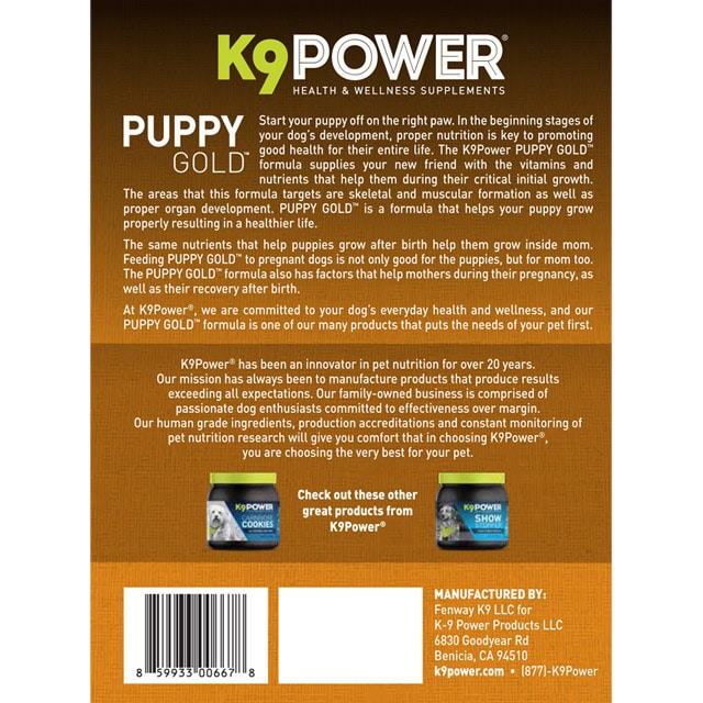 In the beginning stages of your dog’s development, proper puppy nutrition is key to promoting good health for their entire life. A dietary nutritional supplement for puppies, K9 Power PUPPY GOLD,® supplies your new friend with the vitamins and nutrients that help them during their critical initial growth