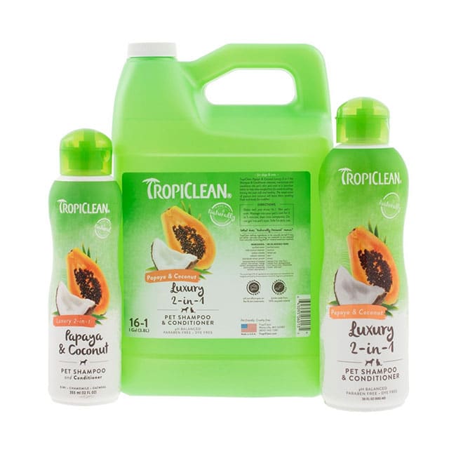 Tropiclean Papaya & Coconut Shampoo and Conditioner is made with papaya, coconut, and other tropical ingredients to pamper your pet in a rich, luxurious lather. Our mild coconut cleanser is one-of-a-kind, just like your pet. Coconut gently cleanses fur of dirt and oils from playtime and head pats, while papaya and kiwi replenish the natural moisture balance of the skin and coat. Rich botanical conditioners result in a healthy sheen, while preventing dry skin and tangled fur. With routine bathing, this luxury 2-in-1 shampoo and conditioner will keep your pet’s skin and coat stay soft, shiny, and looking great.
